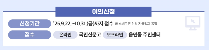 - 접수 기간 : 2025.9.22 ~ 10.31 (소비쿠폰 신청·지급 기간과 동일).