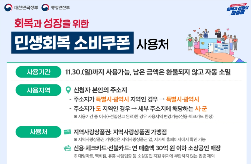 쿠폰은 지역사랑상품권 가맹점, 전통시장, 동네마트, 식당, 카페, 미용실, 안경원, 학원, 약국 등에서 사용 가능합니다. 대형마트, 백화점, 면세점, 온라인 쇼핑몰, 대형 외국계 매장 등에서는 사용할 수 없습니다. 또한 신용·체크카드, 선불카드, 지역사랑상품권 중 선택하여 수령할 수 있습니다.