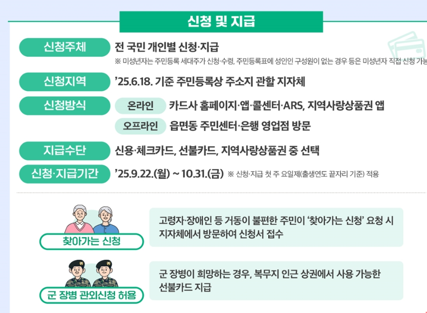 특히 고령자·장애인 등 직접 방문이 어려운 경우에는 ‘찾아가는 신청 서비스’를 통해 지자체 직원이 직접 방문해 신청을 도와줍니다. 또한 군 장병은 군부대 내 선불카드 지급 방식으로 혜택을 받을 수 있습니다.