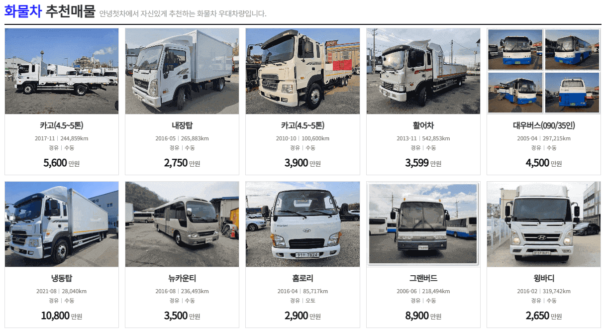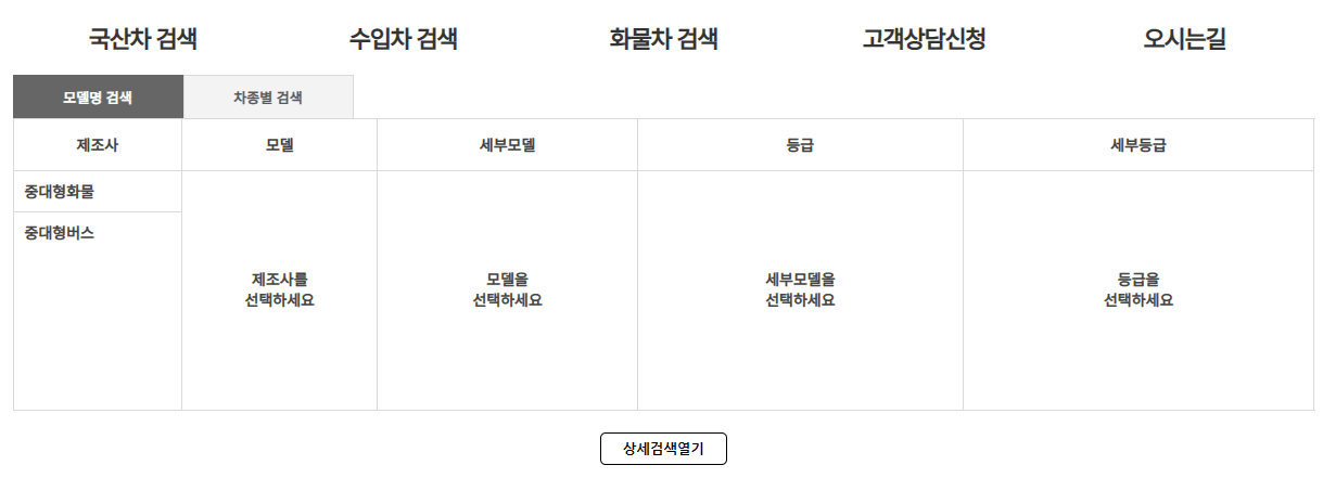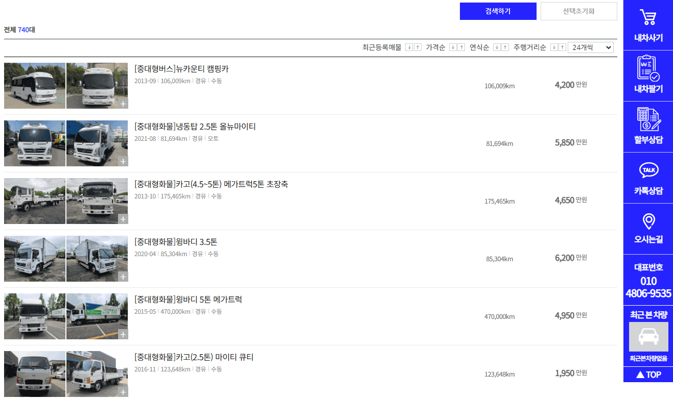 화물차는 현재 740대를 보유 중이고, 국산차, 수입차와 같은 방법으로 검색하시면 원하시는 차량 정보를 얻으실 수 있습니다.