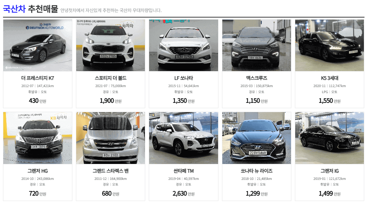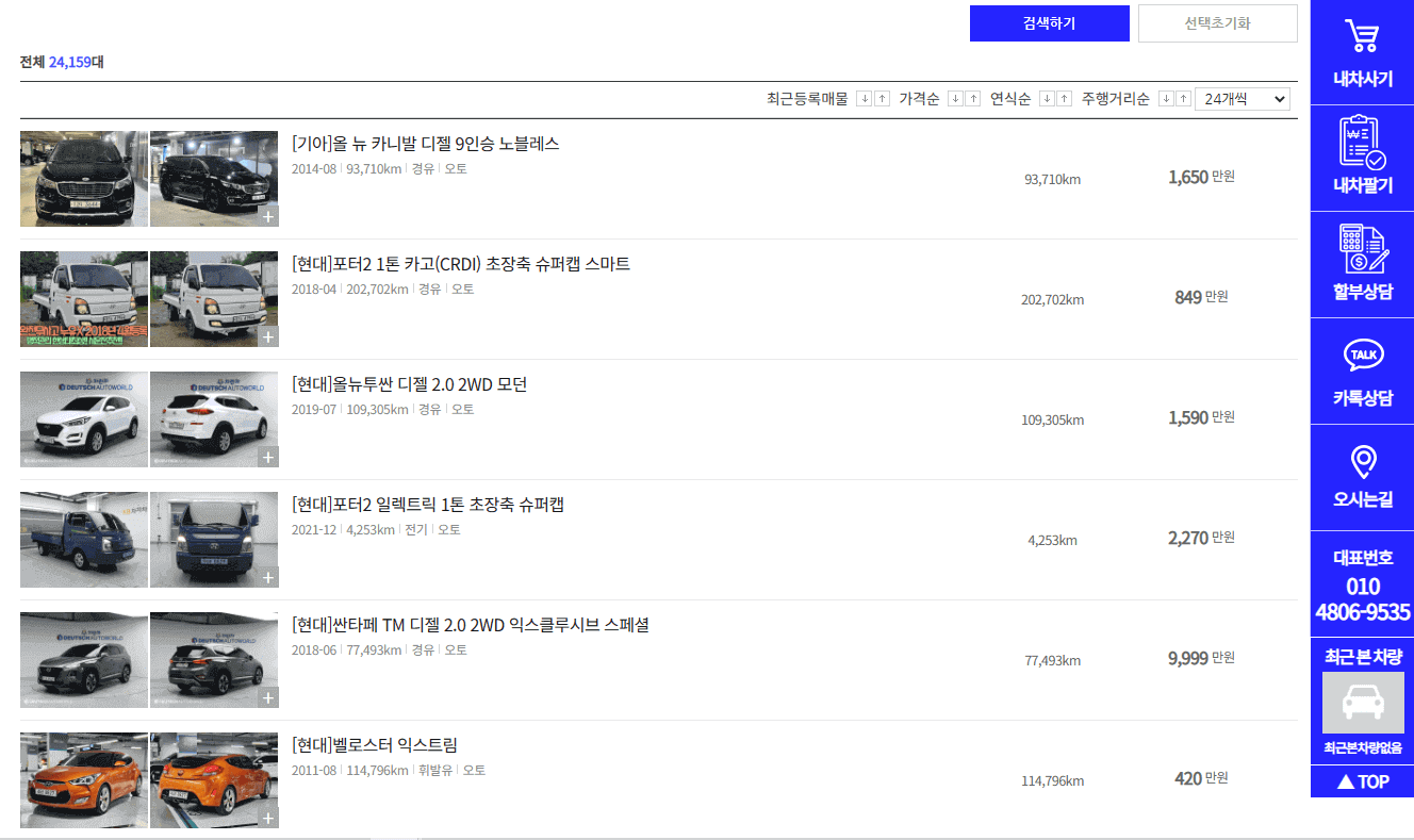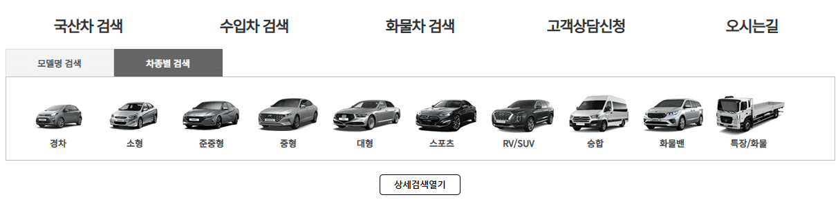 국내 중고차량은 현재 24,111대를 보유 중이며 모델명으로 검색을 할 때에는 제조사, 모델, 세부모델, 등급, 세부등급을 선택하신 후에 상세 검색 열기를 하시면 원하시는 차량을 살펴보실 수 있습니다. 차종별로 검색을 하실 경우에는 경차, 소형, 준중형, 중형, 대형, 스포츠, RV/SUV, 승합, 화물밴, 특장/화물 등으로 검색해 볼 수 있습니다.