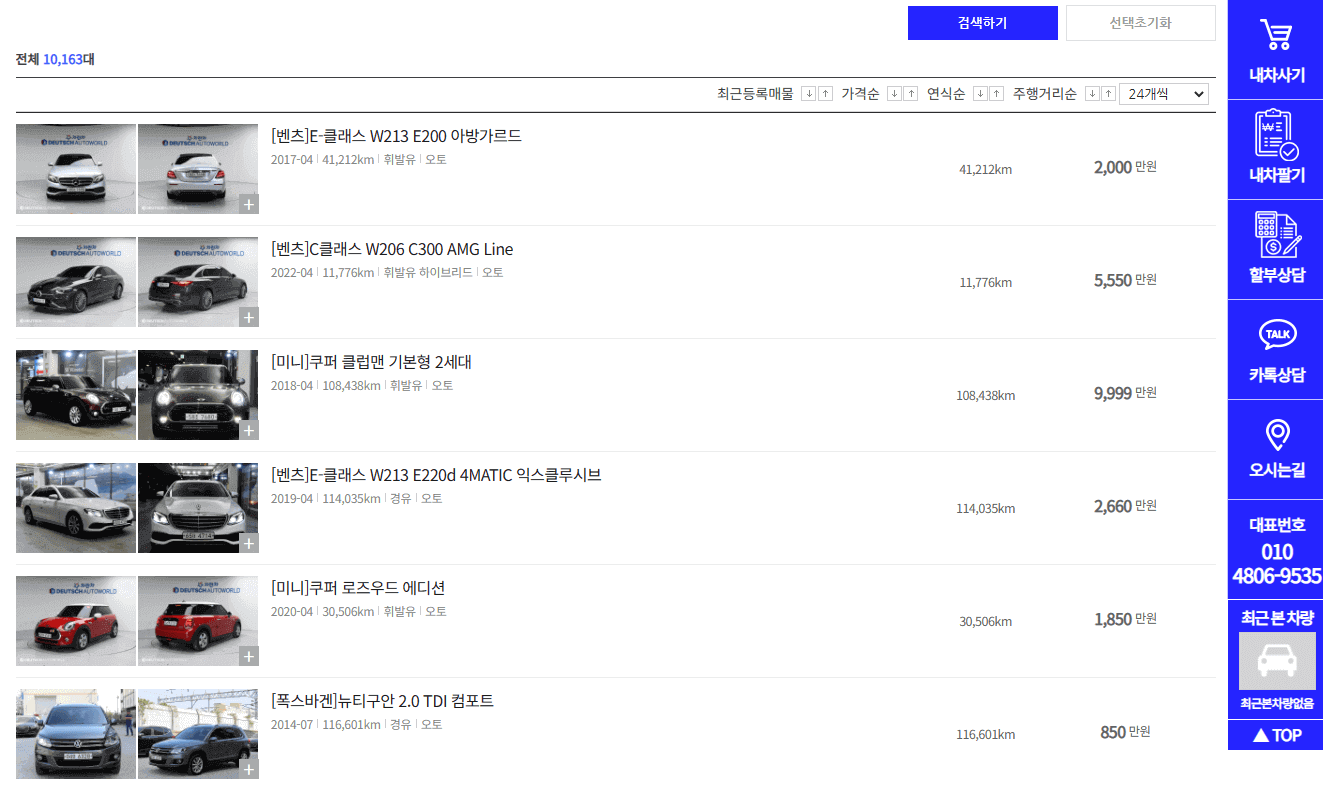 안녕첫차 보유 중인 수입차는 현재 10,183대 이고, 국산차 차량과 마찬가지로 모델명과 차종별 검색 두 가지 중 원하시는 형태로 지정하셔서 상세검색을 하시면 차량 정보를 알 수 있습니다.