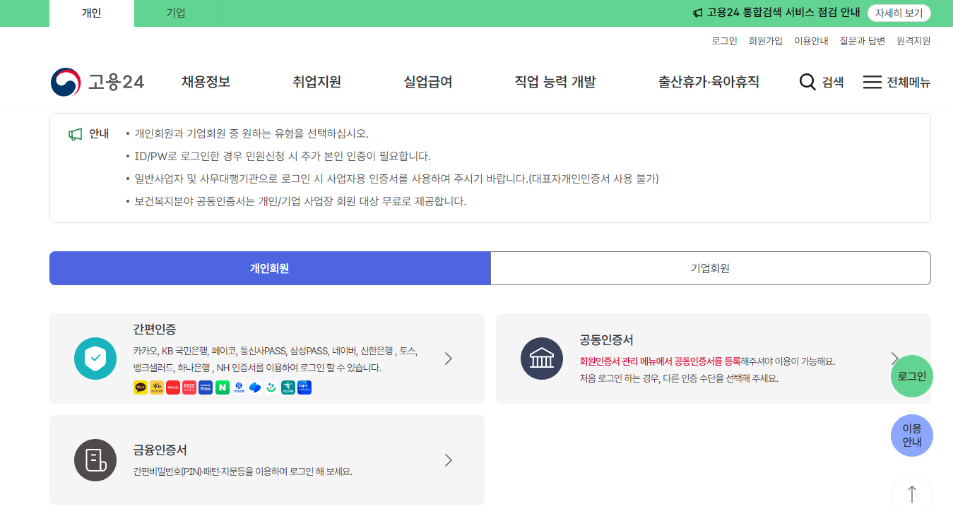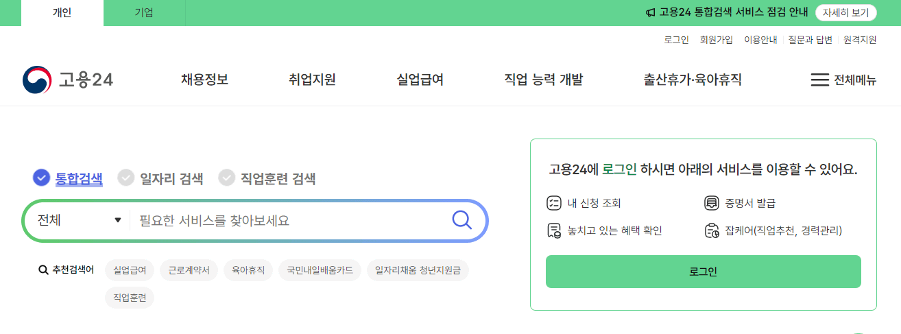 - 마이페이지 → 고용보험 이력 조회